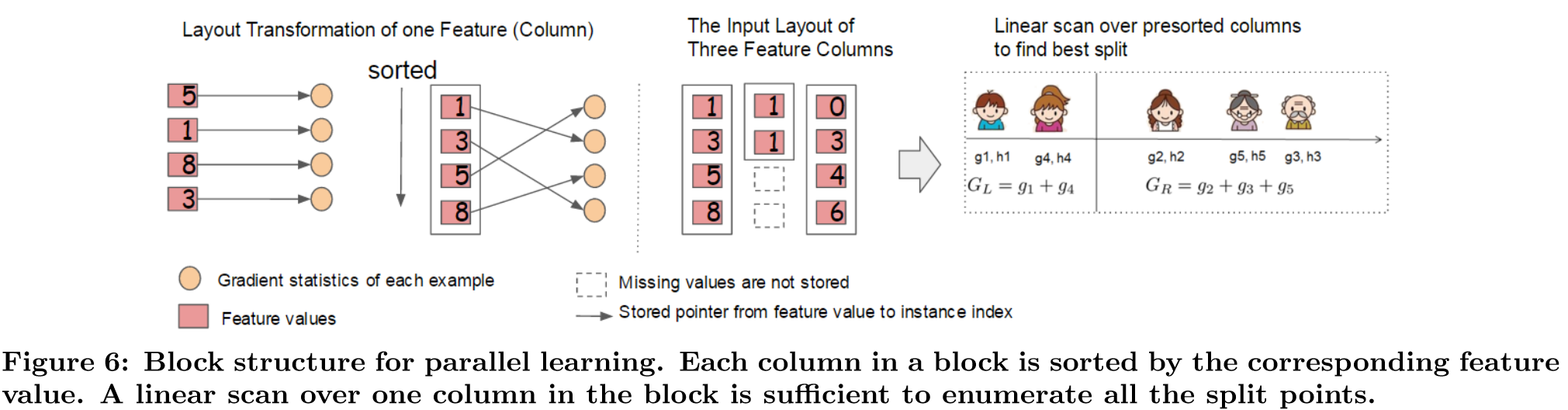 Stored in compressed column (CSC) format - each column is sorted by corresponding feature vaue